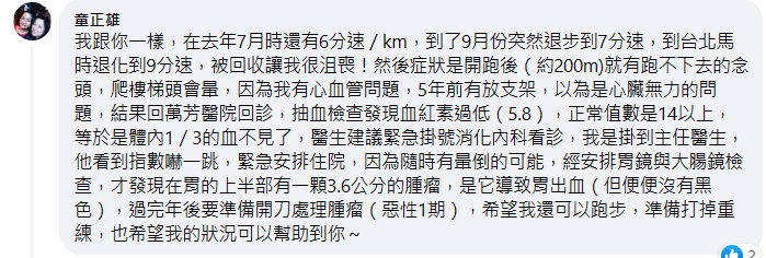 這裡唯一值得慶幸的是,他因為跑步而發現自己的身體有異狀。